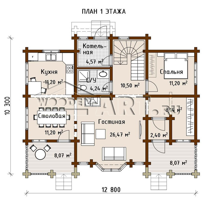 - Размеры дома: 10,3 м х 12,8 м
