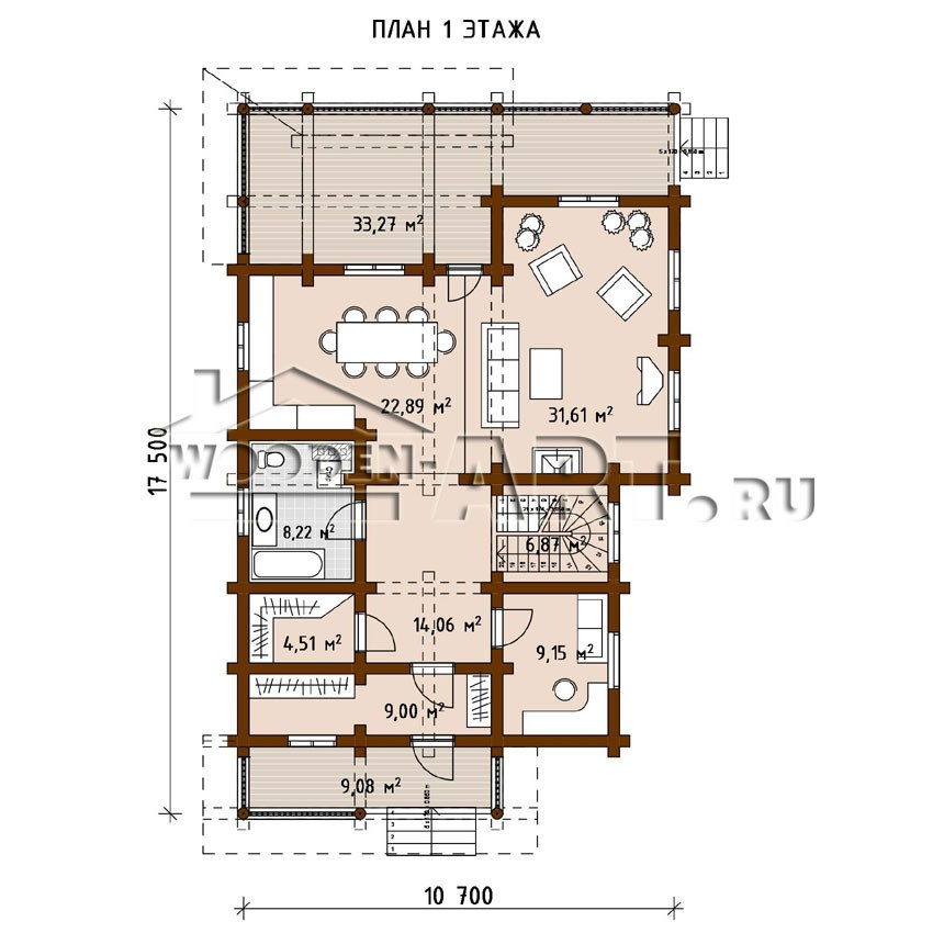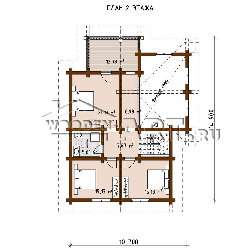 Проект деревянного дома из оцилиндрованного бревна выполнен со стандартным набором помещений, кухней, совмещенной с гостиной. В доме есть второй свет, что благоприятно сказывается на внутреннем пространстве деревянного дома. Если проектировать данный деревянный дом из клееного бруса, остекление второго света можно значительно увеличить, убрав переруб между окнами. В доме есть большая терраса, что необходимо для тех, кто любит больше времени проводить на свежем возухе, и балкон.