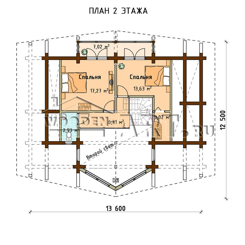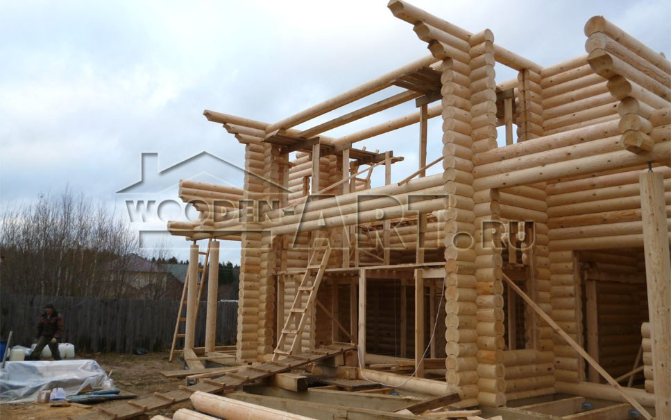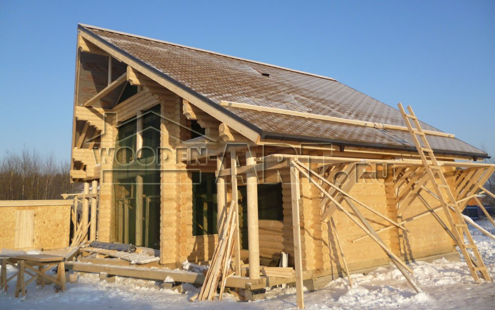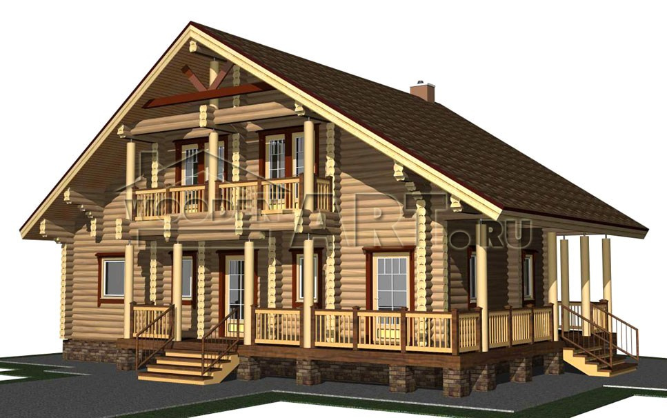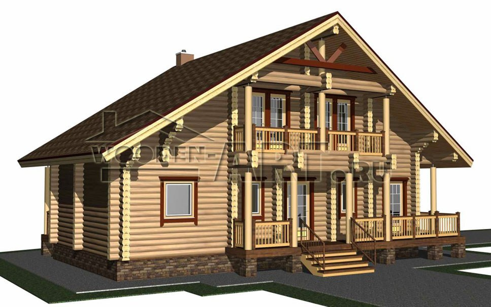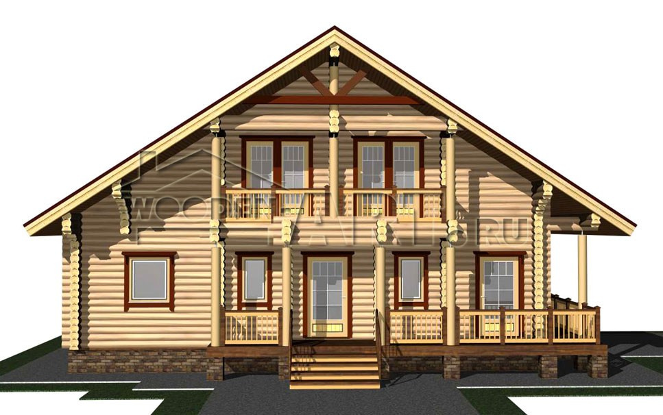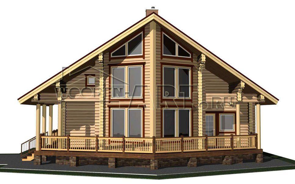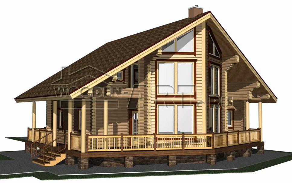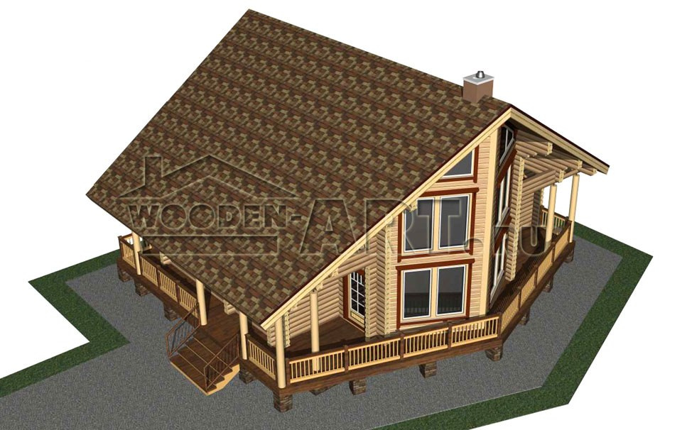 В данном проекте деревянного дома есть эркер, который спроектирован на всю высоту второго света, он имеет треугольную форму и выполняется из каркаса. Эркер будет монтироваться через год, после усадки, во время отделочныйх работ. В проекте предусмотрена очень удобная терраса, которая позволяет обойти дом, не спускаясь на землю, что актуально в дождливую погоду. Но не вся терраса накрыта кровлей. Я обычно рекомендую Заказчикам террасы накрывать, во избежании попадания осадков. Терраса, ненакрытая кровлей, требует к себе больше внимания во время эксплуатации деревянного дома.