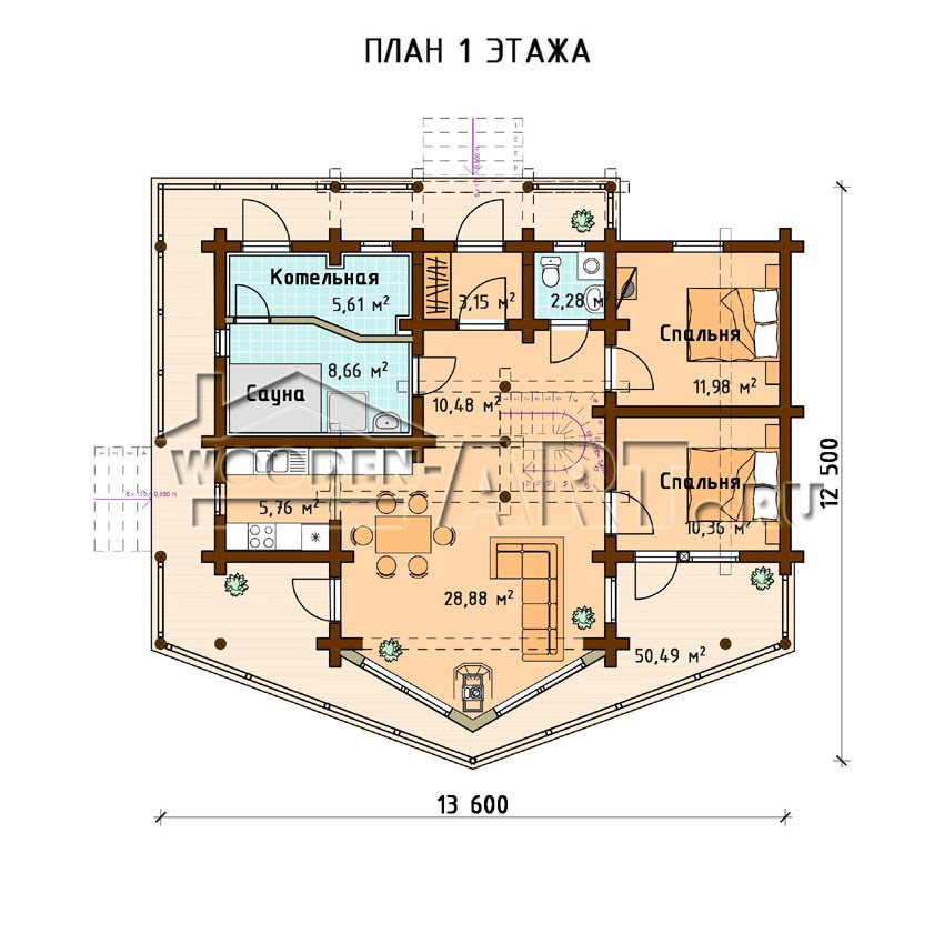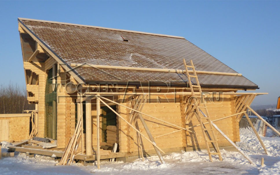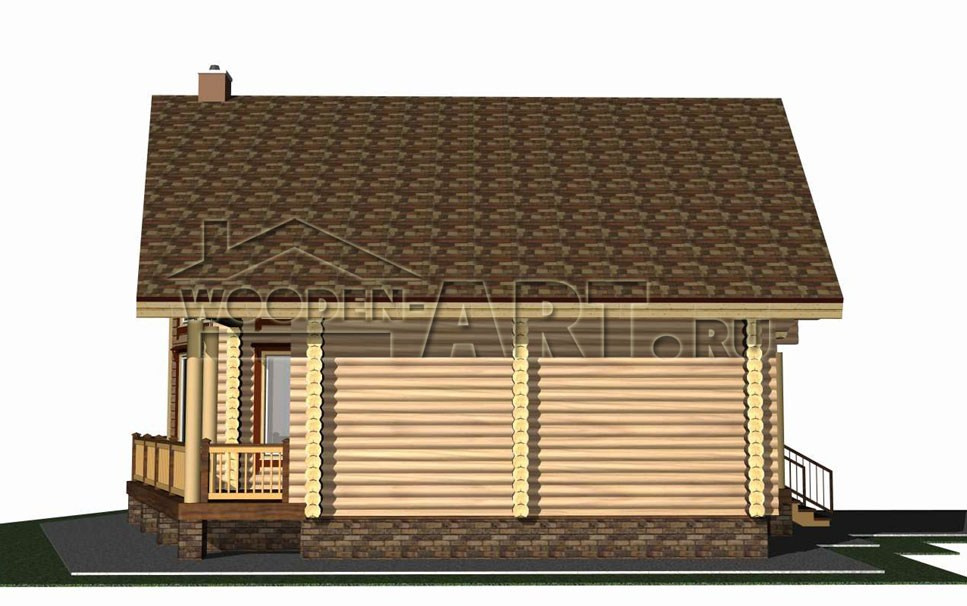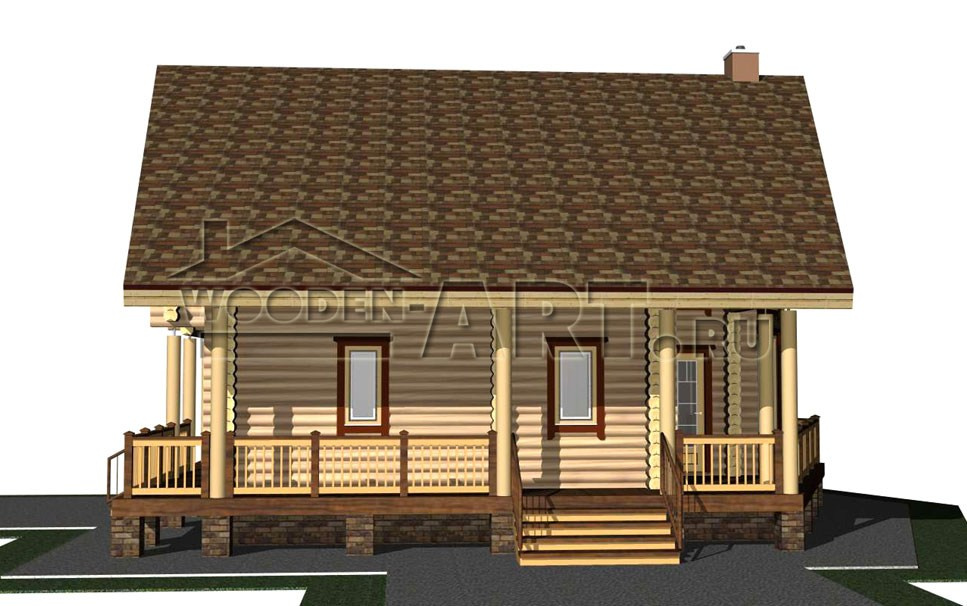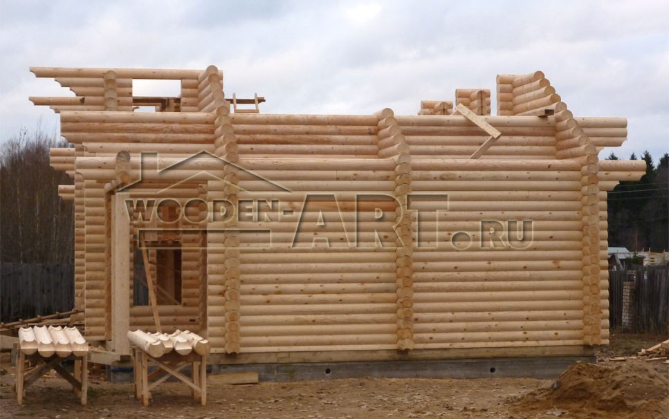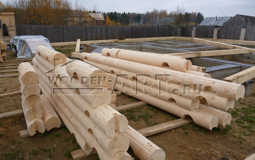 Проект выполнен из профилированного оцилиндрованного бревна с финским пазом. Особенность сборки деревянных домов с финским пазом заключается в использовании шпилечной системы, которая позволяет контролировать усадку сруба. Бревно с финским пазом более плотно прилегает друг другу и не требует конопатки, утепляются только чашки.