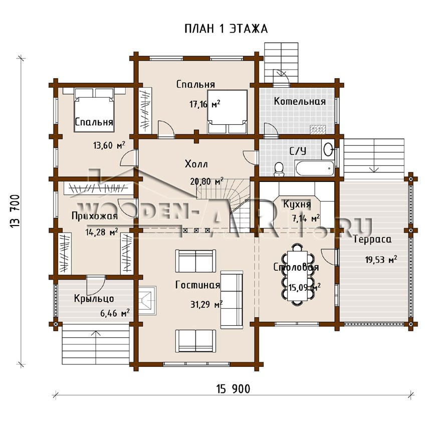 - Размеры дома: 13,7 м х 15,9 м