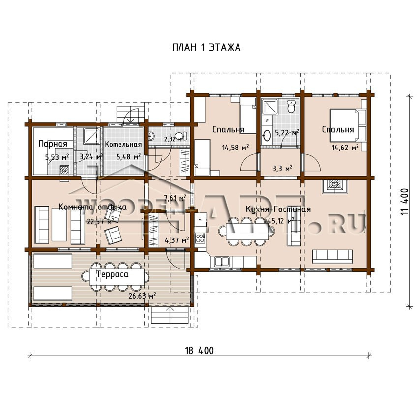 - Размеры дома: 11,4 м х 18,4 м