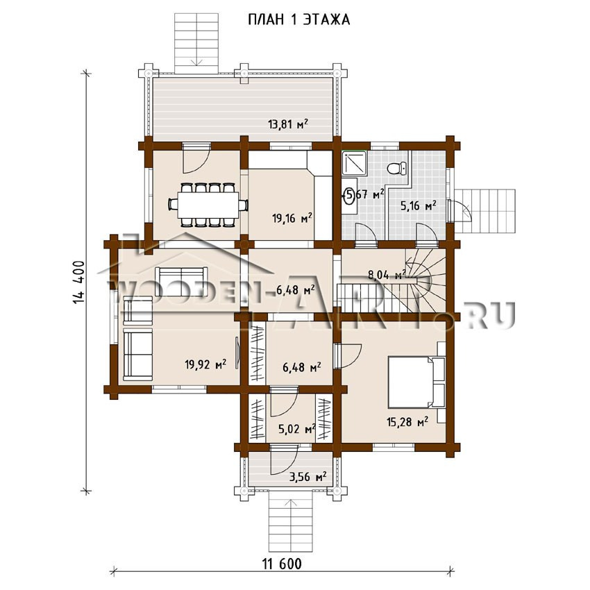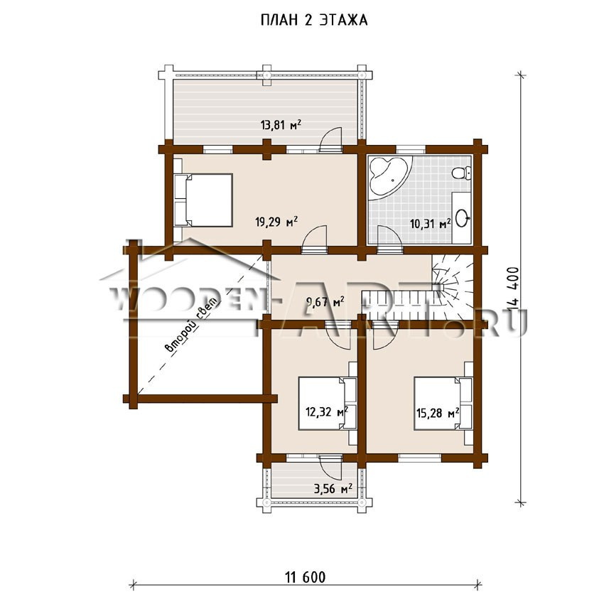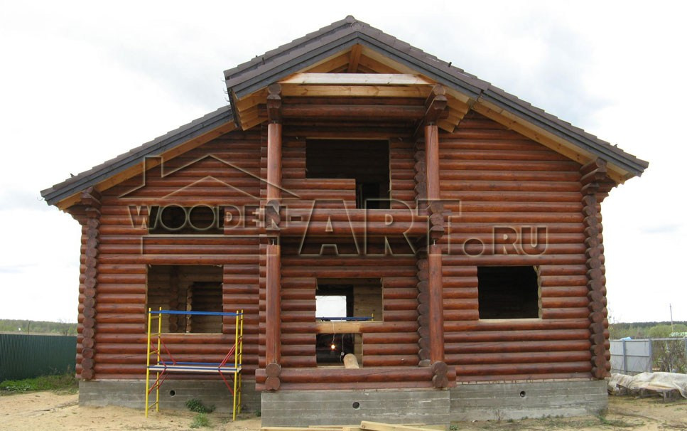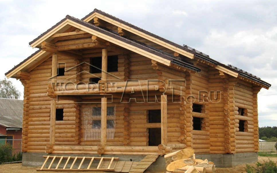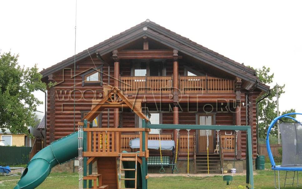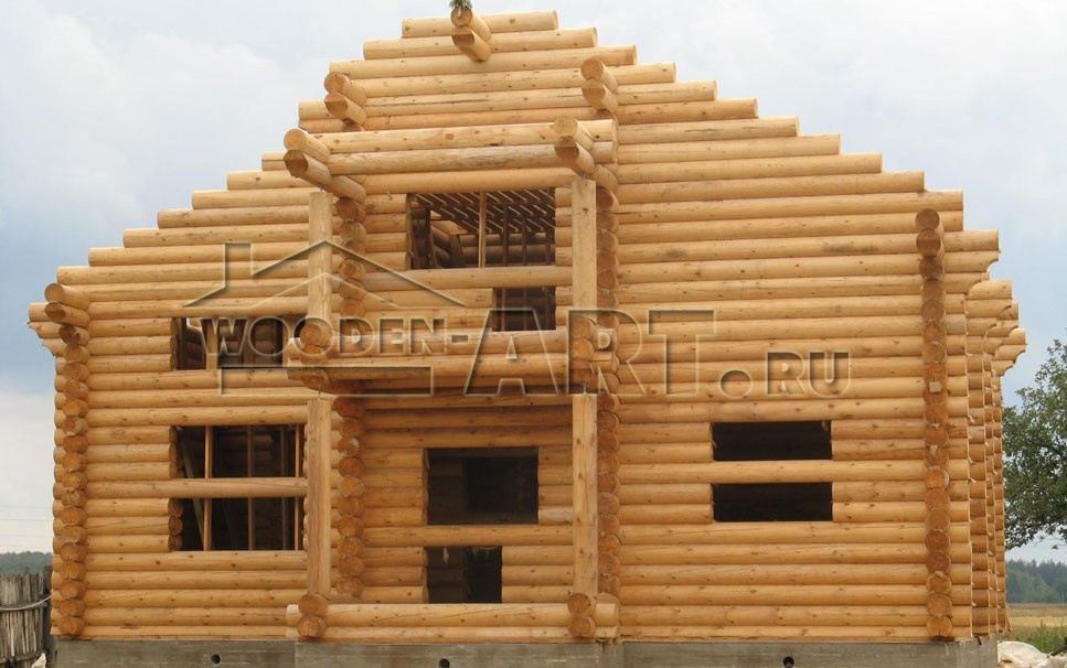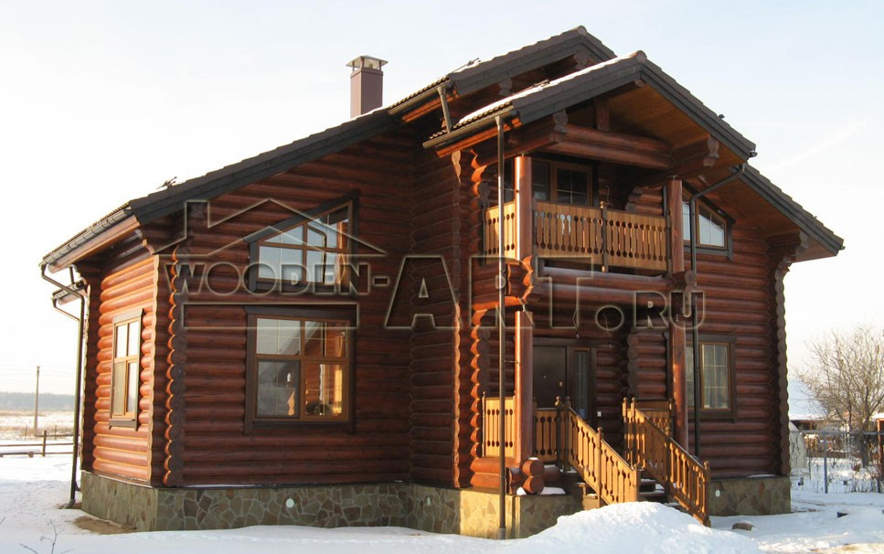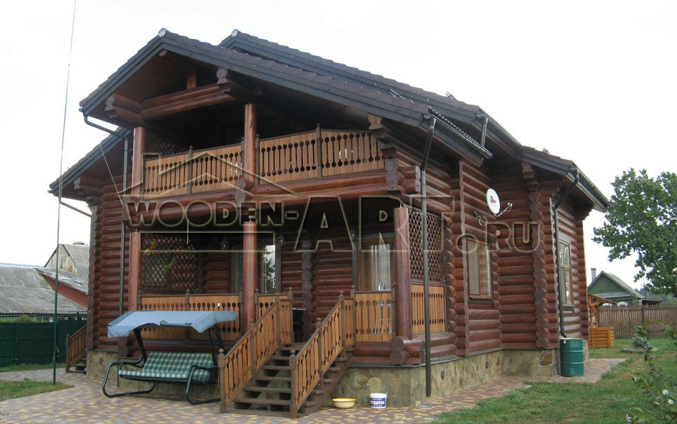 Деревянный дом из оцилиндрованного бревна с двумя балконами и вторым светом в гостиной. В проекте сквозной проход — деревянный дом хорошо садится на вытянутые участки, где въезд с одной стороны дома, а огород и сад с другой стороны. Конструктив кровли деревянного дома был упрощен за счет того, что балконы накрыты собственными крышами, которые не препятствуют скольжению основной крыши при усадке дома.