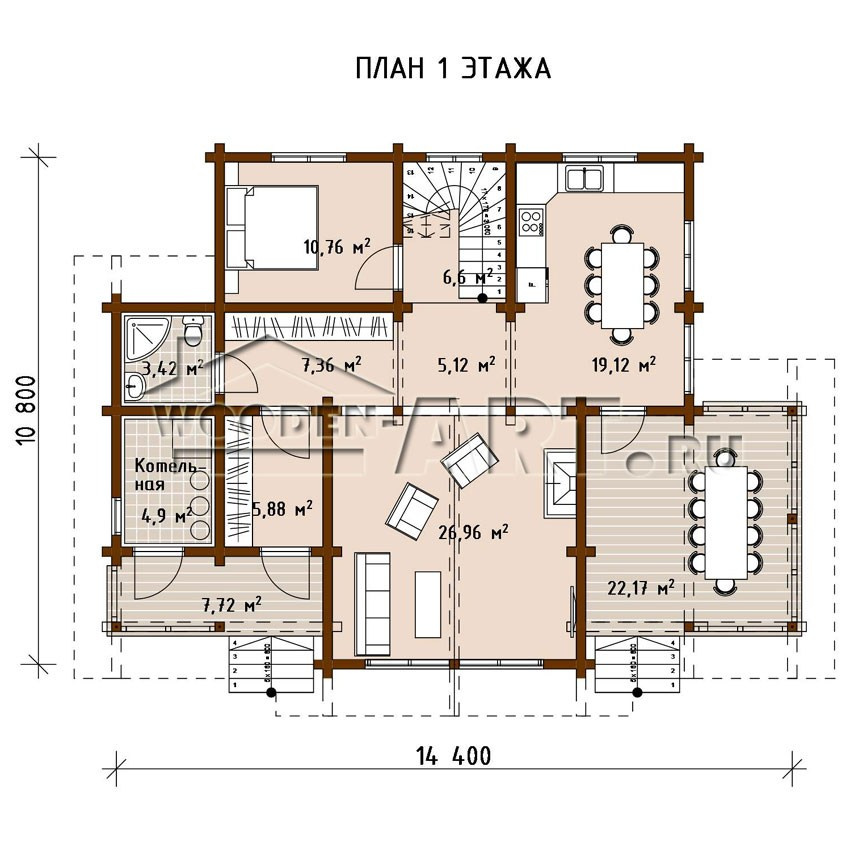 - Размеры дома: 10,8 м х 14,4 м
