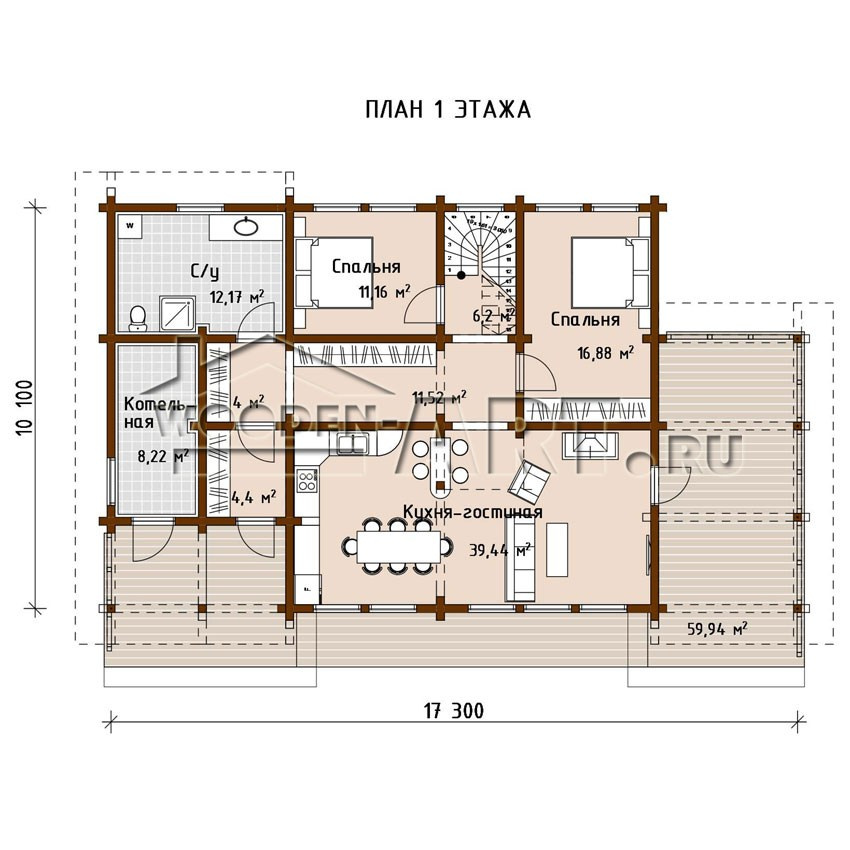 Планировка деревянного дома функциональная и имеет весь необходимый набор помещений для комфорта. Конструктив был задуман максимально простой и экономичный. Красивое большое остекление гостиной придает дому современный вид и стильный интерьер. Клееный брус облегчает многие задачи в проектировании деревянных домов со вторым светом и большим остеклением, т. к. имеет большую длину, высокую прочность и идеально ровную геометрию. Если проектировать этот дом в оцилиндрованном бревне, необходимо пересмотреть некоторые конструктивные моменты, чтоб не ослабить силовую часть строения.